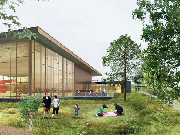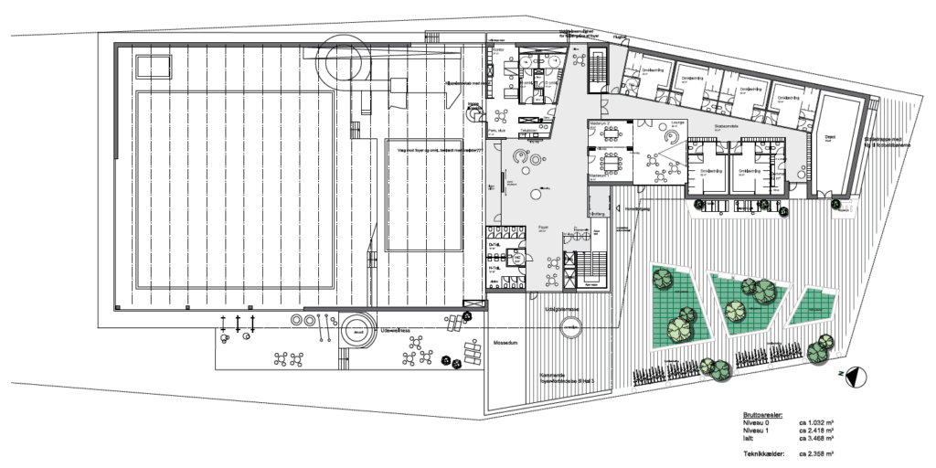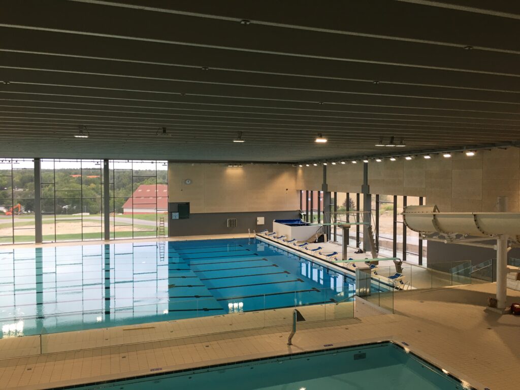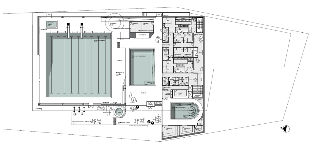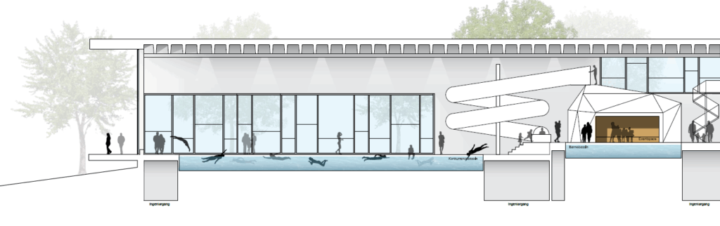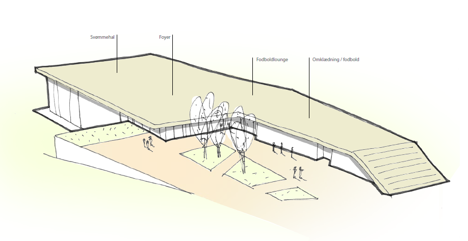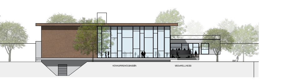 En svømmehal i tre etager med omklædnings- og mødefaciliteter på i alt 5.500 m², heraf svømmebassiner på 1.600 m², omklædningsfaciliteter på 360 m² og wellnessområde på 240 m².